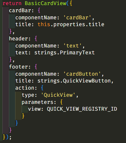 In the CardView.ts file, inside the cardViewParameters method, you can specify the various parts of the card view, starting with SPFx version 1.18 you can return a BasicCardView object, the default object has the following structure: