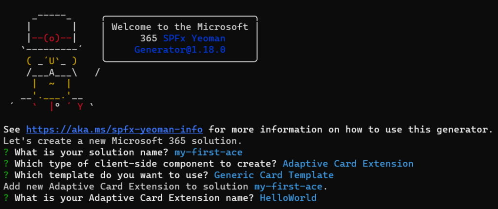 NB: The latest Microsoft SharePoint Yeoman generator (version 1.18.0) is a bit different than the previous version, if you have an older version you will not see the “Generic Card Template” option, instead you will see a selection of ACE template.