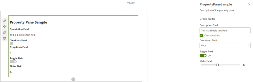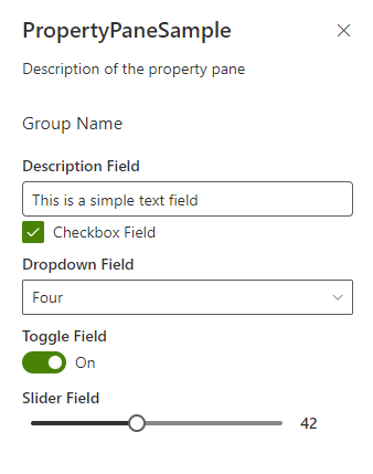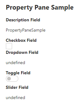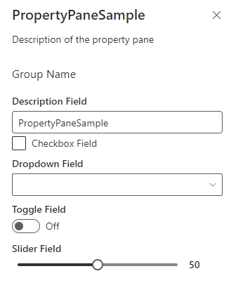 PropertyPaneTextField: displays a text box.PropertyPaneCheckbox: displays a checkbox.PropertyPaneDropdown: displays a dropdown control where you have to define which are the possible selectable options.PropertyPaneToggle: displays a toggle where you can also define the labels for the on or off state.PropertyPaneSlider: displays a slider, you can specify properties such as theminandmaxsupported values and also thestepof the slider.