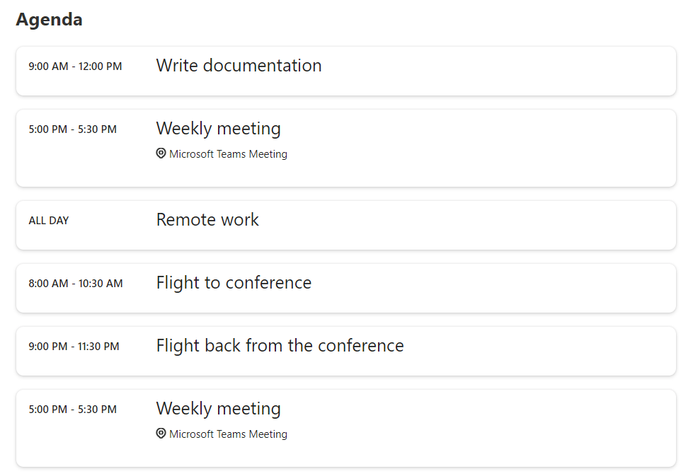 Proceeding with the appointments with the MGT (Microsoft Graph Toolkit) controls today I want to talk about the Agenda control.