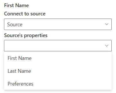 Once that the source has been specified it will be required that the user select the property of the source to be used with the current property. For example in the following image the user is configuring the “First Name” and will select the first option from the drop down:
