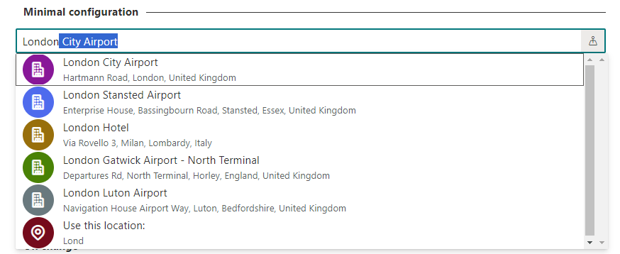 The control renders a text box where the user can type the name of the address of the place that is being searched for, for example if the user is searching for “London City Airport” this can be the resulting UI: