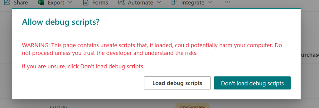 Once the serve.json is set and the gulp command is executed a page will be opened. In the page that will be opened you will be requested if to load or not the debug scripts. To debug your extension simply click on “Load debug scripts”.