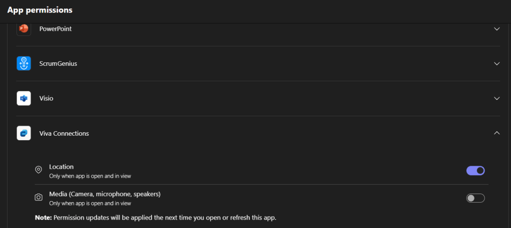 Once opened the App permissions scroll down until you find Viva Connections and enable the location toggle: