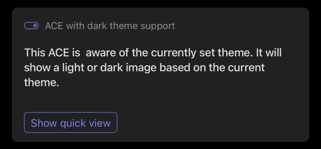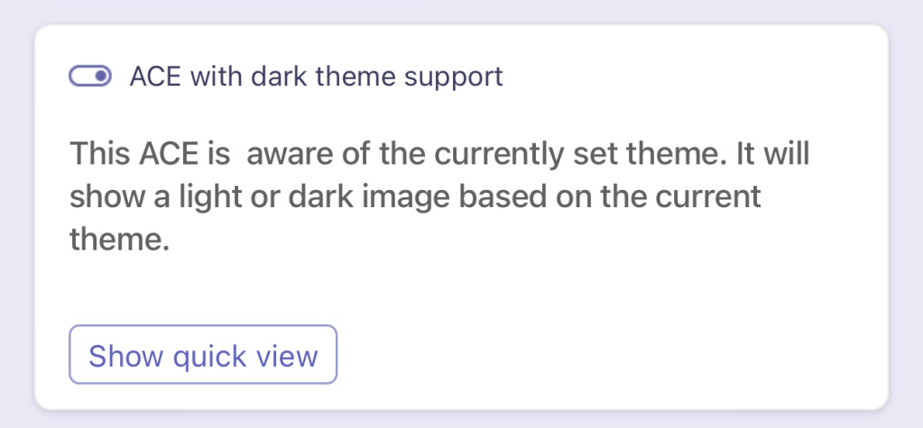You might be wondering: doesn’t the ACE’s already support light and dark theming? And you’d be right, but this is true only for the out of the box controls, what if you want to support a different behavior when using images? Like, per say, a specific image for when the user is using light theme or another image when the user is using a dark theme.