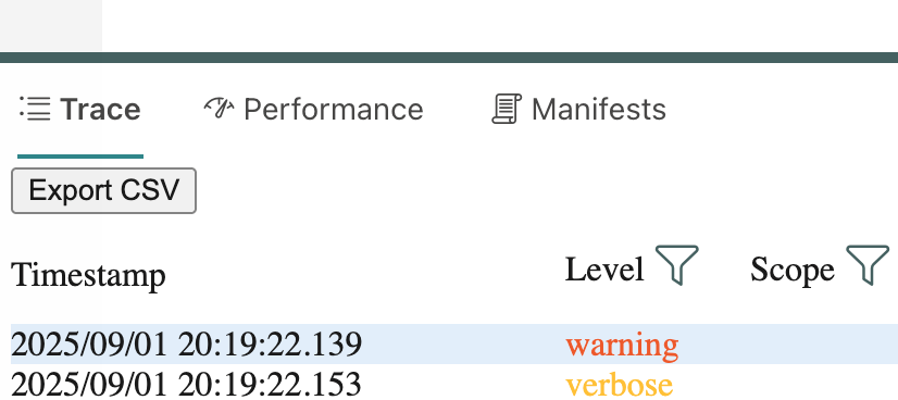 This tab contains all the logging information available in the current page, it also offers the ability to export those as a CSV file.