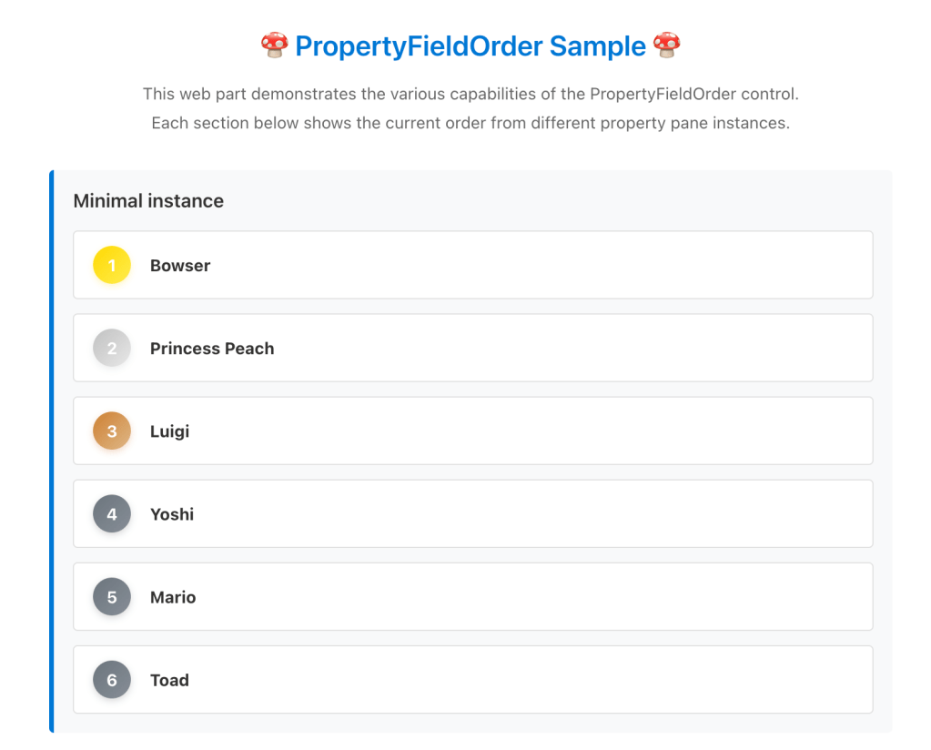 The PropertyFieldOrder control allows to reorder a list of items so here, for example, if Princess Peach throws a tortoise to Bowser, the rank can change to the following (Bowser lose two positions):