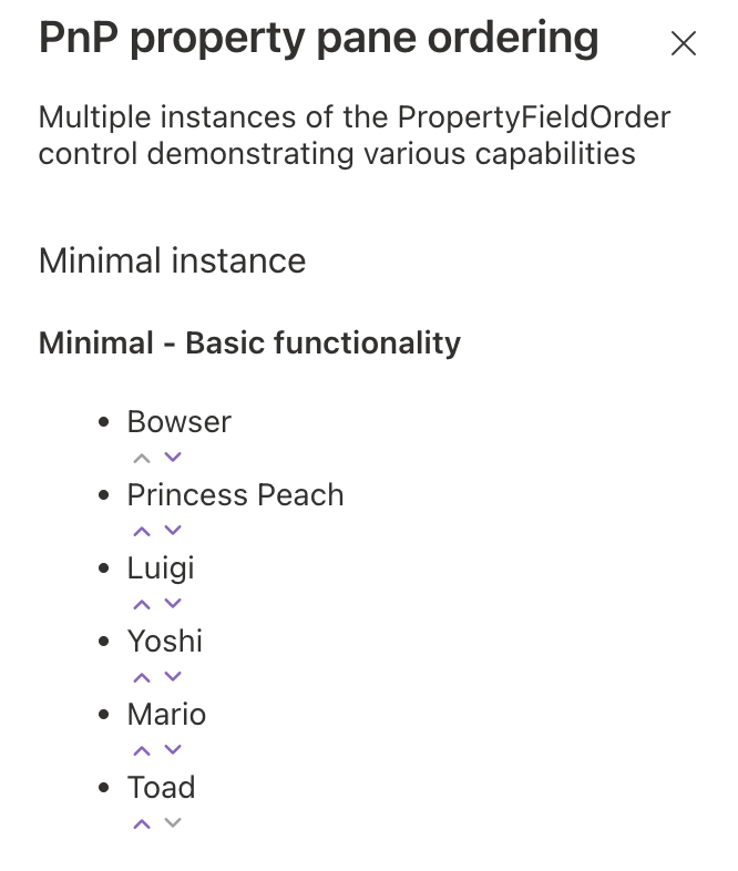 The minimal instance of the control shows what is the minimum configuration needed to use the PropertyFieldOrder. Each of the following instances will have the same set of basic properties plus the instance specific ones.