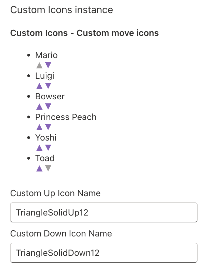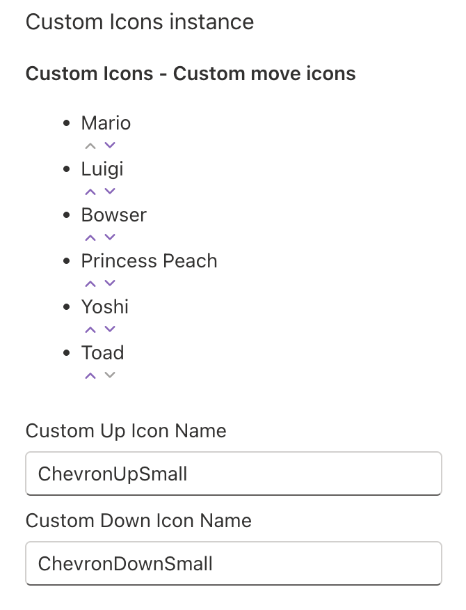 moveUpIconName: the Fluent UI icon name to be used as the up arrow.moveDownIconName: the Fluent UI icon name to be used for the down arrow.