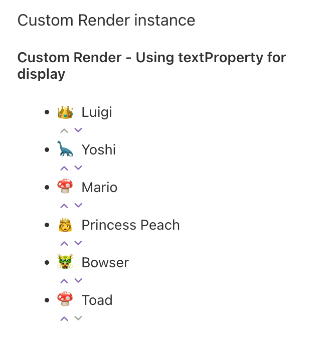 PropertyFieldOrder('customRenderOrder', { key: 'customeRenderOrderFieldId', label: strings.CustomRenderLabel, items: this.properties.customRenderOrder, onRenderItem: this.renderMarioCharacter, properties: this.properties, onPropertyChange: this.onPropertyPaneFieldChanged,})